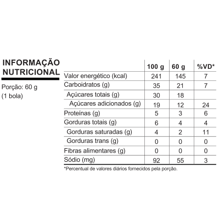 Ingredientes: água filtrada, sacarose, leite em pó integral, glucose, gordura vegetal, soro de leite e rabanada assada (água filtrada, leite condensado, sacarose, leite em pó integral e canela). Espessantes: gelatina e carragena. Estabilizante: monoestearato de glicerina. Aromatizante. Corantes Naturais: urucum e cúrcuma.
